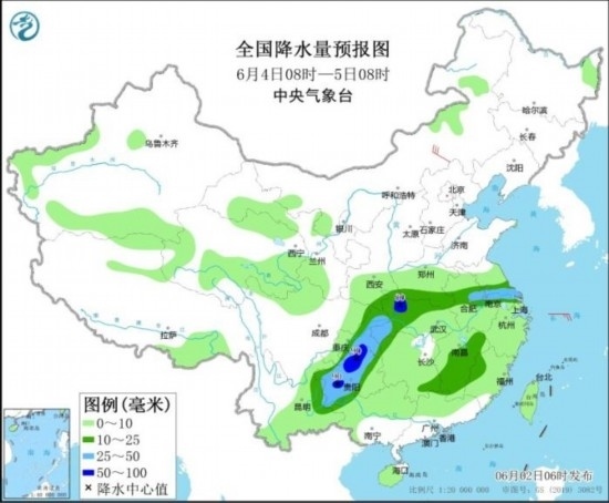 全國(guó)降水量預(yù)報(bào)圖(6月2日08時(shí)-3日08時(shí))