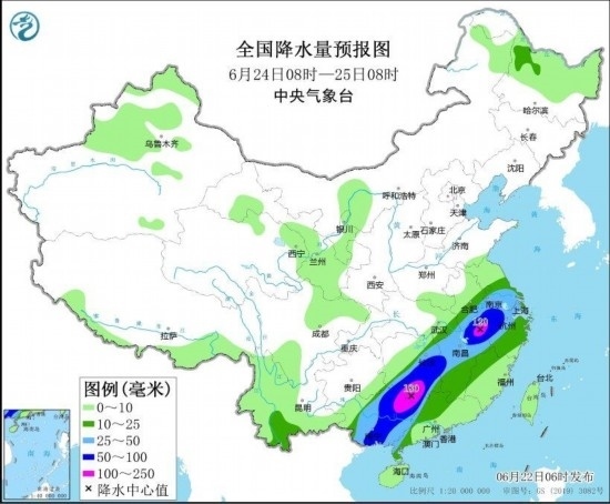 6月24日08時(shí)至25日08時(shí),廣西中東部、廣東西北部、湖南南部和東部、江西中北部、安徽南部、江蘇南部、上海、浙江西部等地部分地區(qū)有大到暴雨,其中,廣西東北部、湖南南部、安徽南部等地局地有大暴雨(100~180毫米)(見(jiàn)圖5)。