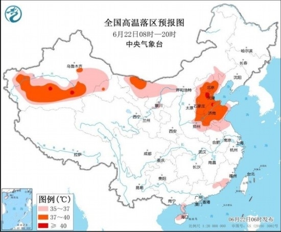 圖2 全國(guó)高溫落區(qū)預(yù)報(bào)(6月22日08時(shí)-20時(shí)) 圖自中央氣象臺(tái)網(wǎng)站