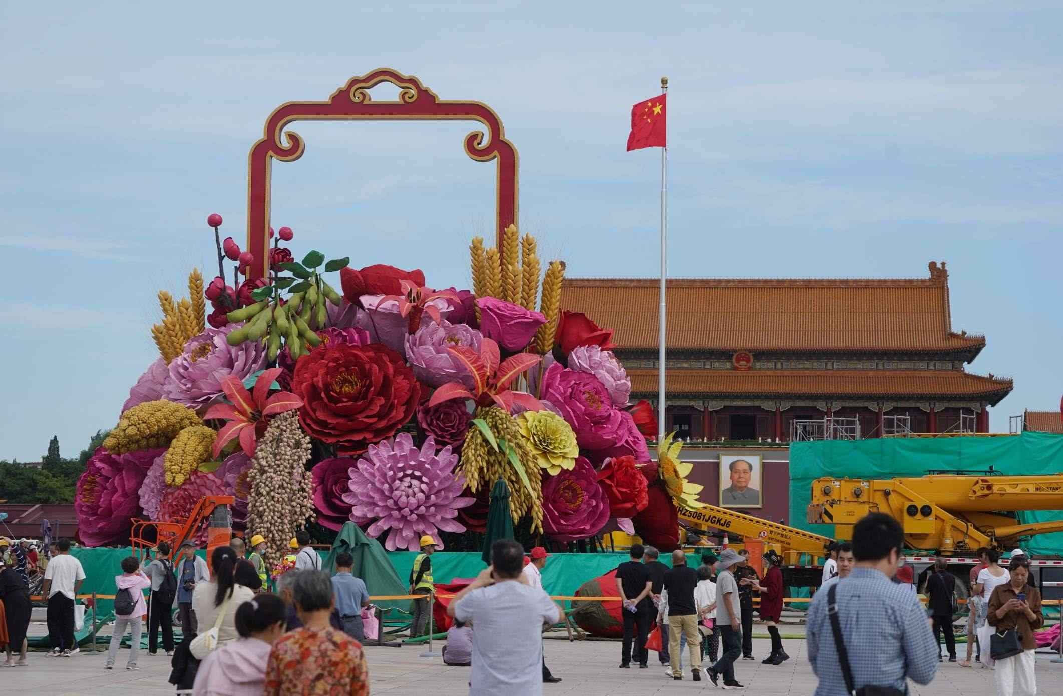 今年,天安門廣場中心的“祝福祖國”主題花壇以喜慶的花籃為主景?;@內(nèi)選取了擁有美好寓意的花卉和喜慶豐收的五谷(水稻、小麥、小米、黃米、大豆),體現(xiàn)花團(tuán)錦簇、五谷豐登。