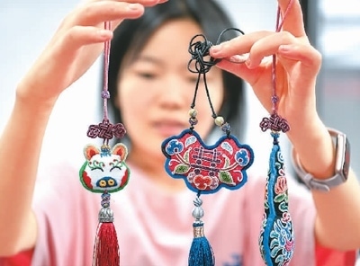 多彩貴州文化產(chǎn)業(yè)投資集團(tuán)的工作人員在展示苗繡文創(chuàng)產(chǎn)品。