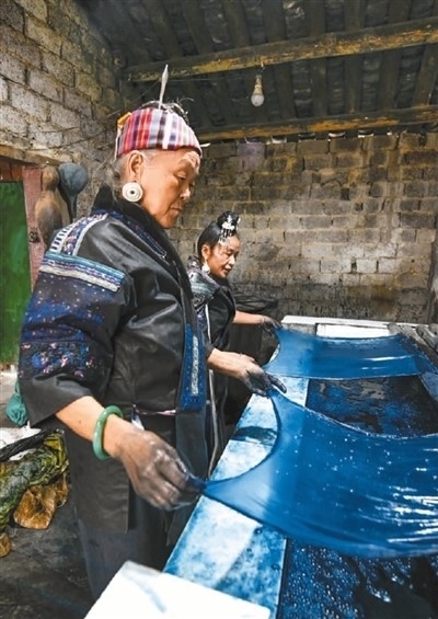 在貴州省臺(tái)江縣萃文街道仰黎坊,苗繡傳承人潘玉珍(前)與女兒在染布。