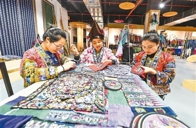 在苗族聚居的貴州,近年來(lái)將這一文化瑰寶作為產(chǎn)業(yè)大力推動(dòng)發(fā)展,婦女們背著娃、繡著花、養(yǎng)活自己養(yǎng)活家,不僅用一針一線“繡”出美好生活,還將蘊(yùn)藏著古老文化的苗繡巧妙融入時(shí)尚元素,形成產(chǎn)業(yè)融合互動(dòng)。如今,古老的苗繡日益走進(jìn)大眾生活,煥發(fā)蓬勃生機(jī)。