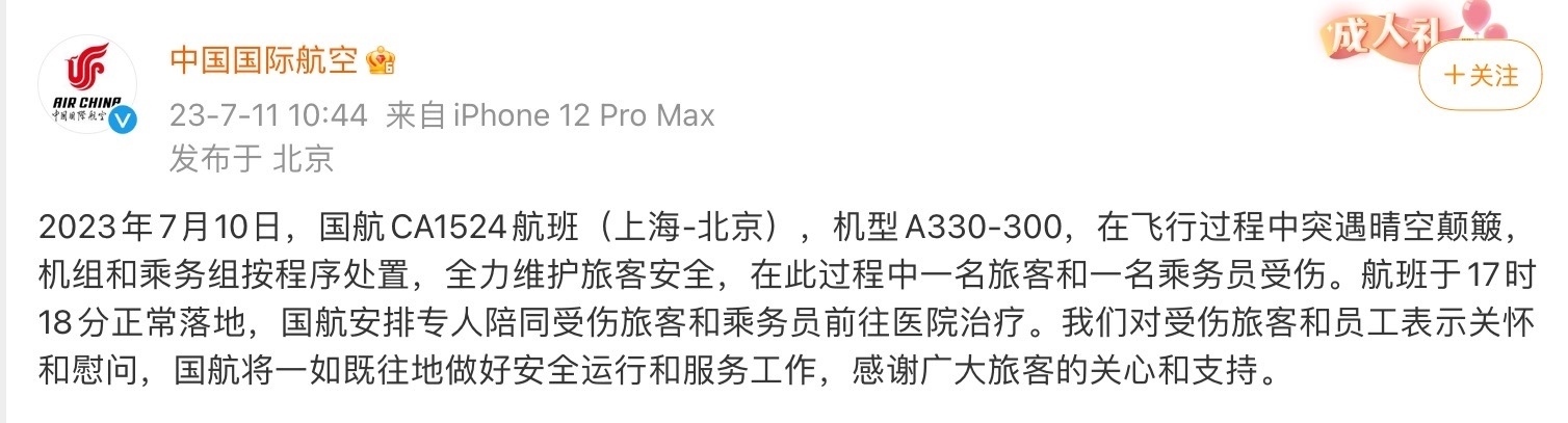7月11日,中國國際航空在其官方微博發(fā)布通報(bào):2023年7月10日,國航CA1524航班(上海-北京),機(jī)型A330-300,在飛行過程中突遇晴空顛簸,機(jī)組和乘務(wù)組按程序處置,全力維護(hù)旅客安全,在此過程中一名旅客和一名乘務(wù)員受傷。航班于17時18分正常落地,國航安排專人陪同受傷旅客和乘務(wù)員前往醫(yī)院治療。