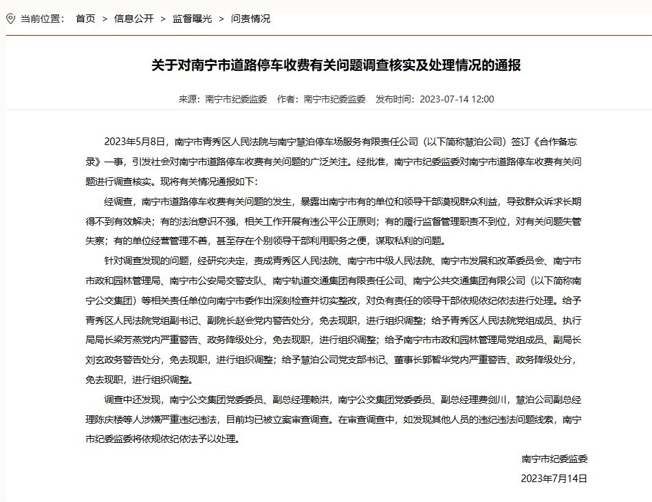 ·南寧通報(bào)道路停車收費(fèi)有關(guān)問題處理情況:4人被免職。