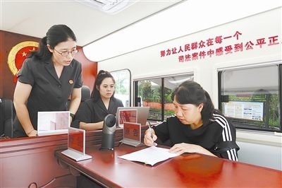 圖③:干警在“車載便民法庭”對調(diào)解協(xié)議現(xiàn)場進(jìn)行司法確認(rèn)。