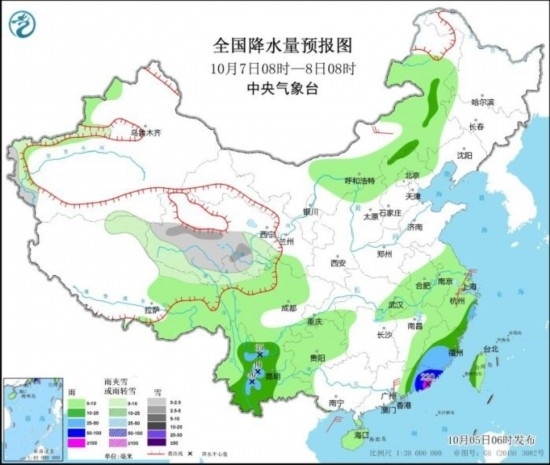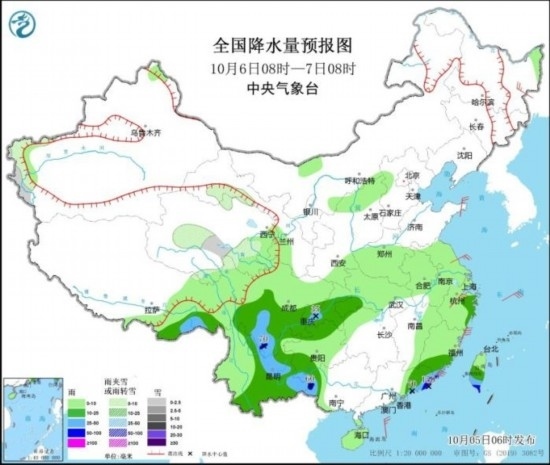 全國降水量預(yù)報(bào)圖(10月5日08時(shí)-6日08時(shí))