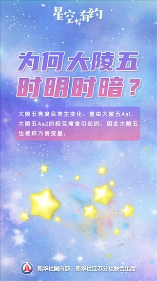 新華社南京11月4日電(記者王玨玢、邱冰清)11月的夜晚,東北方向的夜空之中閃爍著“一顆”時明時暗的星星。每隔兩三天,它的亮度就會經(jīng)歷一輪變化,周而復始,就好像會“眨眼”一樣。這就是著名的變星:大陵五。變星是怎么回事?大陵五為什么會“眨眼”?天文科普專家為您揭秘。