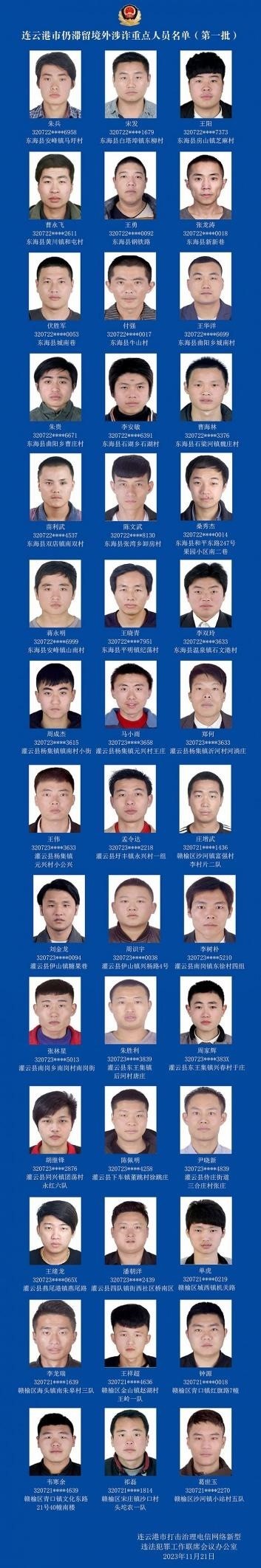 ·江蘇連云港警方發(fā)布首批42名非法滯留境外涉詐重點(diǎn)人員名單,要求滯留人員主動(dòng)于2023年12月20日前通過正規(guī)渠道入境回國(guó),并在入境前向戶籍地派出所報(bào)備。對(duì)于拒不回國(guó)投案自首的,司法機(jī)關(guān)將依法嚴(yán)懲。
