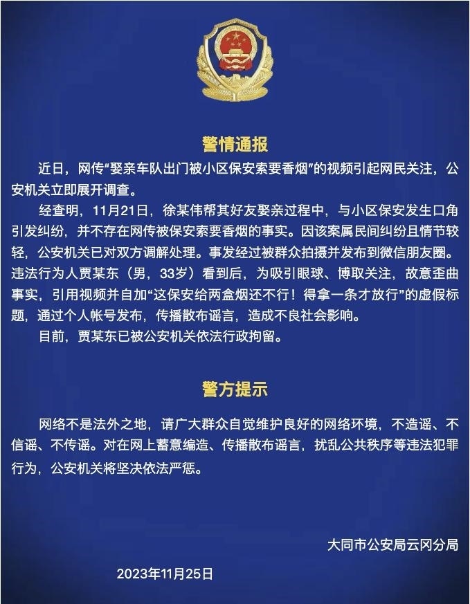 ·大同警方:網(wǎng)傳“娶親車隊(duì)出門被小區(qū)保安索要香煙”系謠言。