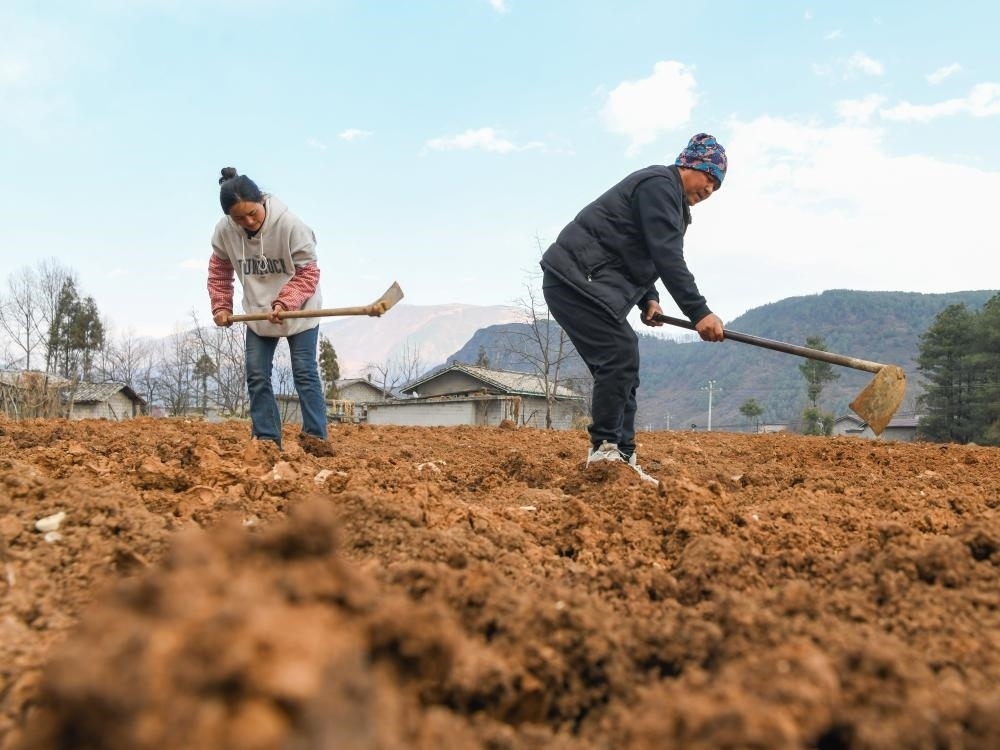 2月2日,巴木玉布木(左)和丈夫巫其石且在翻耕承包的土地,準備來年種植葡萄。新華社記者 王曦 攝