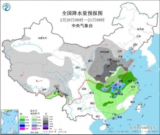 2月20日8時(shí)至21日8時(shí),內(nèi)蒙古中西部、新疆南部、青藏高原大部、西北地區(qū)東部、華北、黃淮等地部分地區(qū)有小到中雪或雨夾雪,其中,陜西南部、華北南部、黃淮中西部、湖北北部等地部分地區(qū)有大到暴雪(10~18毫米)。江淮大部、江漢東部、江南北部、重慶東北部等地部分地區(qū)有中到大雨,局地有暴雨(50~85毫米)。內(nèi)蒙古西部、陜西北部、遼東半島、山東半島、江蘇南部、浙江中部等地部分地區(qū)有4~6級(jí)風(fēng)。渤海、黃海大部海域有7~8級(jí)風(fēng),陣風(fēng)9級(jí)。
