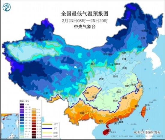 全國最低氣溫預(yù)報(bào)圖(2月23日8時(shí)-25日20時(shí))