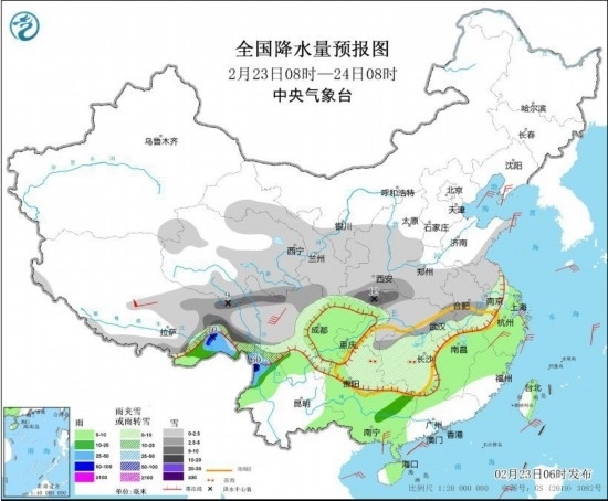 2月23日8時(shí)至24日8時(shí),西北地區(qū)大部、西藏東部、川西高原、山西中南部、河南大部、江漢、江淮、江南北部和西部、西南地區(qū)東南部等地的部分地區(qū)有小到中雪或雨夾雪,其中西藏東部、陜西南部、湖北東部和南部等地的部分地區(qū)有大雪,局地暴雪(10~12毫米)。江南中東部、四川盆地、華南中西部、貴州西南部、云南北部、西藏東南部等地有小到中雨,其中西藏東南部、云南西北部等地的部分地區(qū)有大雨,局地暴雨(50~60毫米)。遼東半島、山東半島、浙江、廣西南部沿海等地的部分地區(qū)有4~6級(jí)風(fēng),西藏中部、川西高原的部分地區(qū)風(fēng)力可達(dá)7級(jí)以上。臺(tái)灣海峽、南海東北部海域有6~7級(jí)、陣風(fēng)8級(jí)的東北風(fēng)。