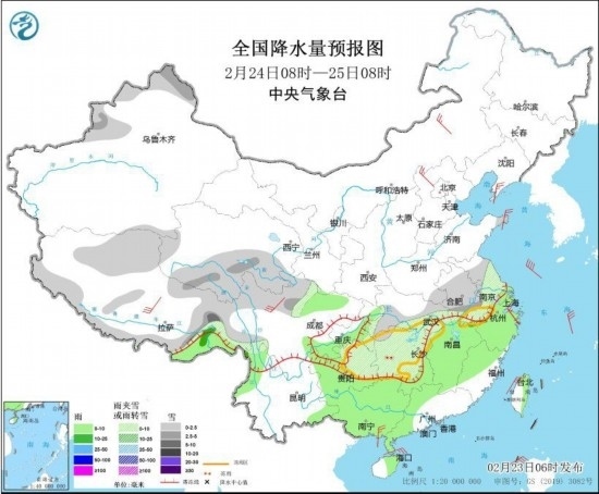 全國降水量預(yù)報(bào)圖(2月23日8時(shí)-24日8時(shí))