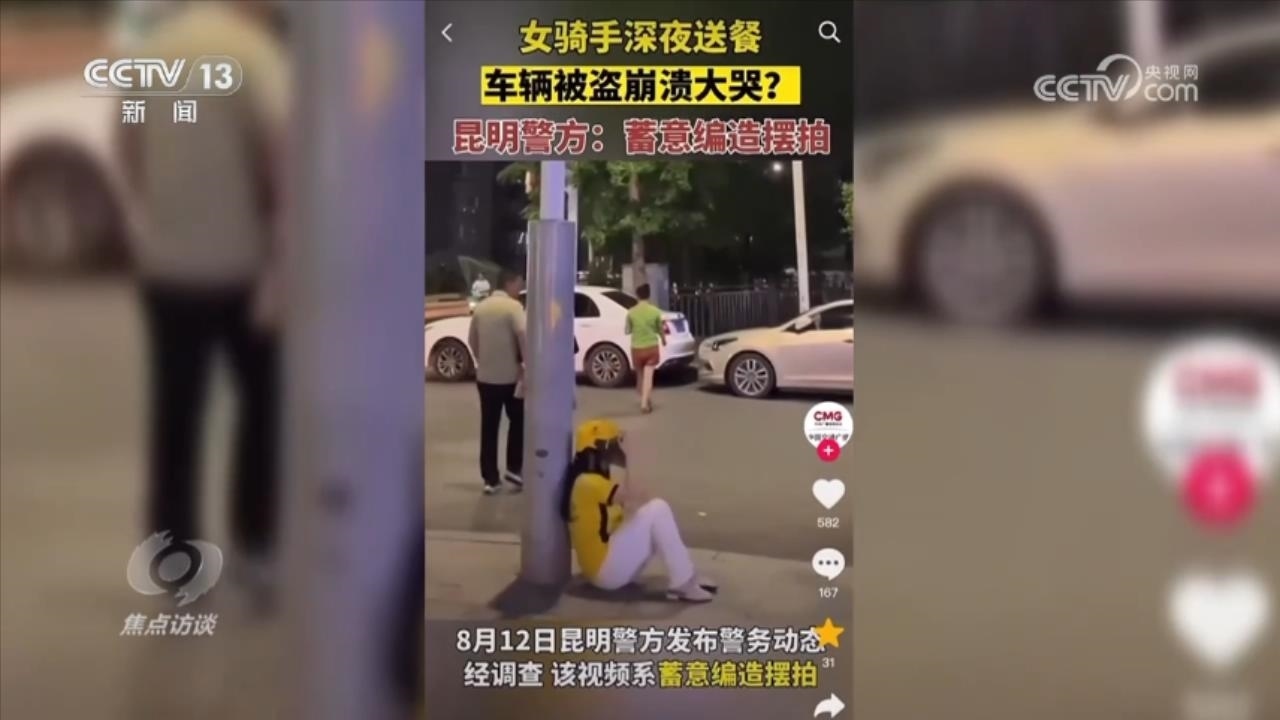 2023年8月3日,某網(wǎng)絡(luò)平臺發(fā)布了一個短視頻,除了哭泣聲,上面文字打的是“深夜,外賣姐姐送餐,下樓發(fā)現(xiàn)車被偷了”。然而,就是這樣一個時長僅10秒左右的視頻,當(dāng)晚瀏覽量已超6000萬次,并在多個平臺迅速傳播,進(jìn)入熱榜,隨即點(diǎn)贊、收藏量超過10萬次。同樣,這些也引起了警方的關(guān)注,經(jīng)調(diào)查核實(shí),該視頻為擺拍,發(fā)布者就是畫面中表演的女子,其丈夫在旁負(fù)責(zé)道具和指導(dǎo)。而他們當(dāng)時擺拍的全過程被大街上的戶外監(jiān)控記錄了下來。