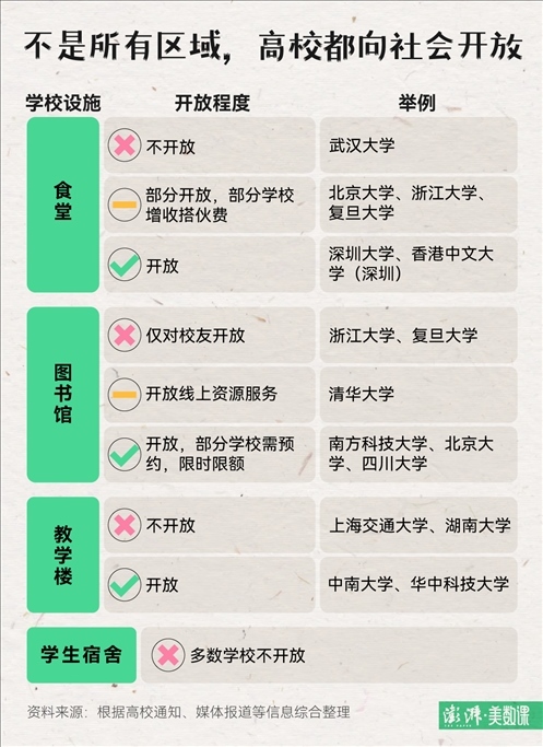 最令在校學(xué)生頭疼的要與游客爭(zhēng)搶學(xué)校資源的問(wèn)題,例如食堂、圖書(shū)館和教學(xué)樓等,各個(gè)學(xué)校在決定開(kāi)放校園的同時(shí)也給出了相關(guān)規(guī)定。