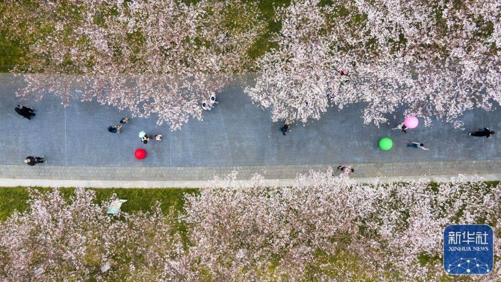 3月23日,游人在浙江省金華市國(guó)際友城公園櫻花大道上賞景游玩(無(wú)人機(jī)照片)。新華社發(fā)(胡肖飛攝)