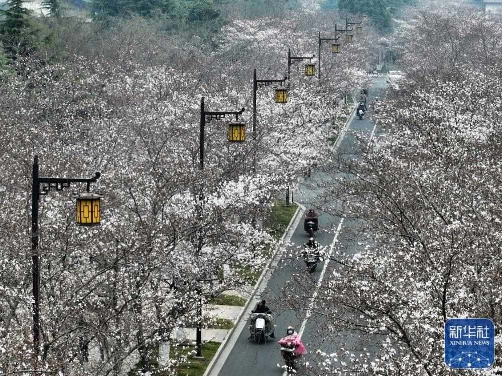 3月23日拍攝的江蘇省揚(yáng)州市鑒真路的“櫻花大道”景色(無(wú)人機(jī)照片)。新華社發(fā)(孟德龍攝)