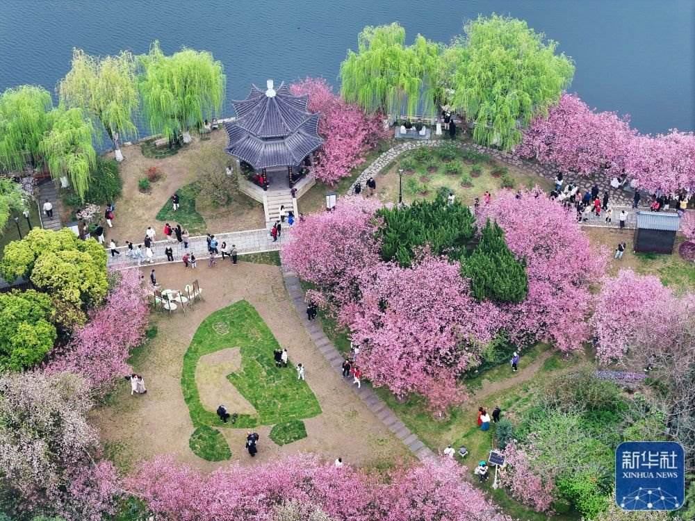 3月23日,游客在南京莫愁湖公園內(nèi)賞花游玩(無(wú)人機(jī)照片)。新華社發(fā)(楊素平攝)