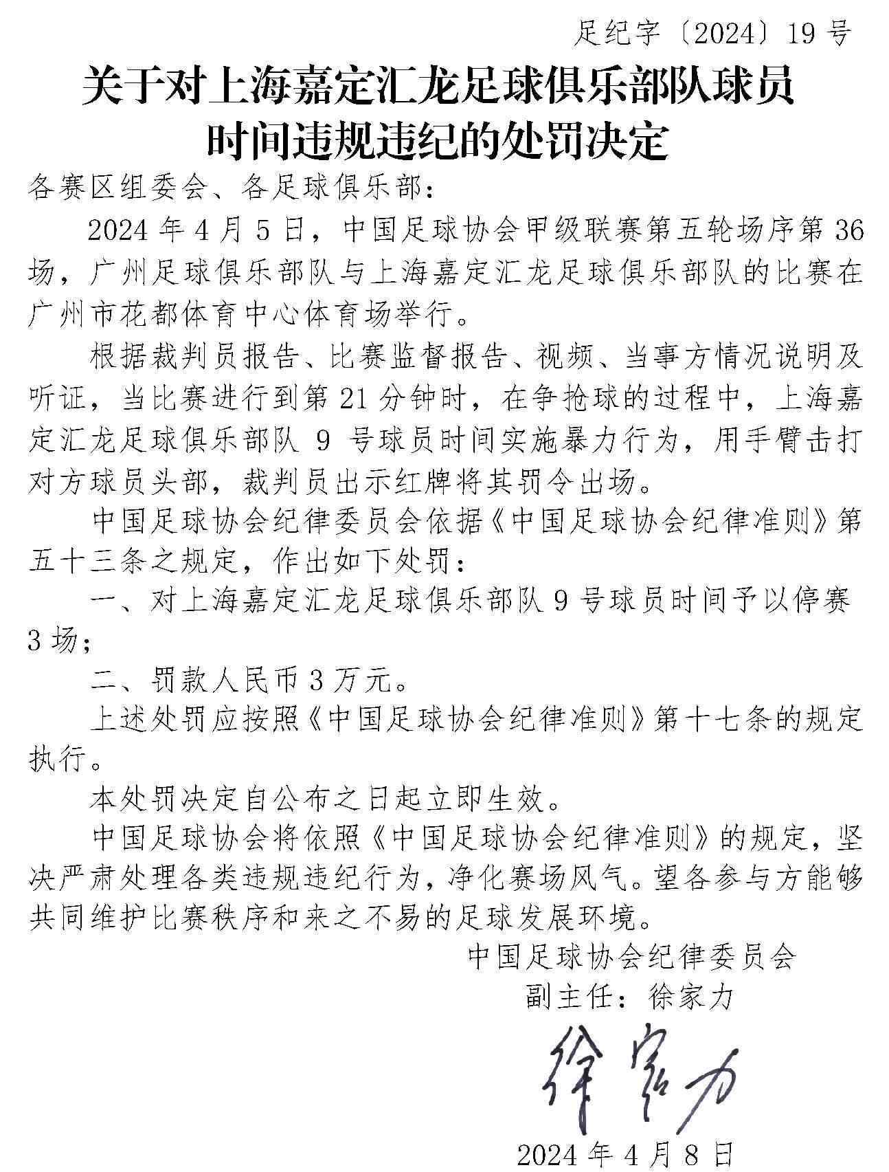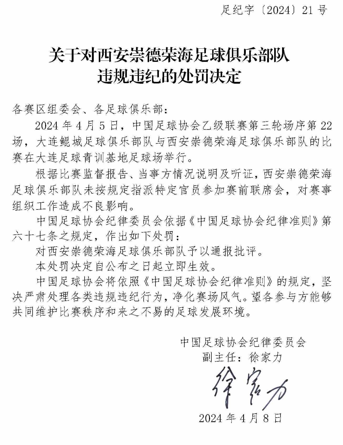 央視網(wǎng)消息:4月10日,中國(guó)足協(xié)網(wǎng)站發(fā)布《關(guān)于對(duì)上海嘉定匯龍足球俱樂(lè)部隊(duì)球員時(shí)間違規(guī)違紀(jì)的處罰決定》《關(guān)于對(duì)西安崇德榮海足球俱樂(lè)部隊(duì)違規(guī)違紀(jì)的處罰決定》《關(guān)于對(duì)大連鯤城足球俱樂(lè)部隊(duì)違規(guī)違紀(jì)的處罰決定》三份處罰決定。中甲聯(lián)賽上海嘉定匯龍9號(hào)球員因暴力行為被停賽罰款。中乙聯(lián)賽大連鯤城與西安崇德榮海兩家俱樂(lè)部因未按規(guī)定指派特定官員參加賽前聯(lián)席會(huì),被通報(bào)批評(píng)。