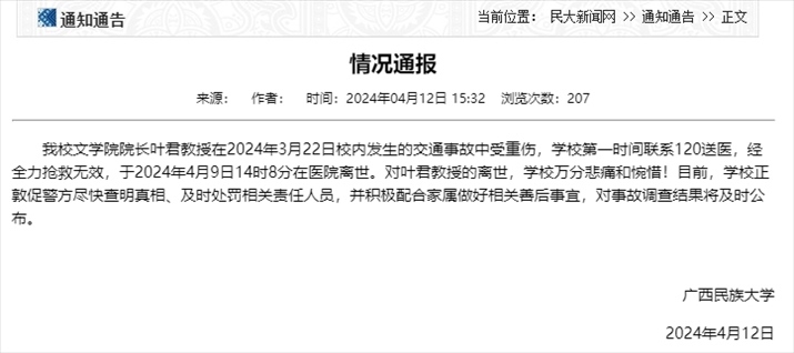央視網(wǎng)消息:據(jù)廣西民族大學(xué)網(wǎng)站消息,廣西民族大學(xué)4月12日發(fā)布情況通報,該校文學(xué)院院長葉君教授在2024年3月22日校內(nèi)發(fā)生的交通事故中受重傷,學(xué)校第一時間聯(lián)系120送醫(yī),經(jīng)全力搶救無效,于2024年4月9日14時8分在醫(yī)院離世。對葉君教授的離世,學(xué)校萬分悲痛和惋惜!目前,學(xué)校正敦促警方盡快查明真相、及時處罰相關(guān)責(zé)任人員,并積極配合家屬做好相關(guān)善后事宜,對事故調(diào)查結(jié)果將及時公布。