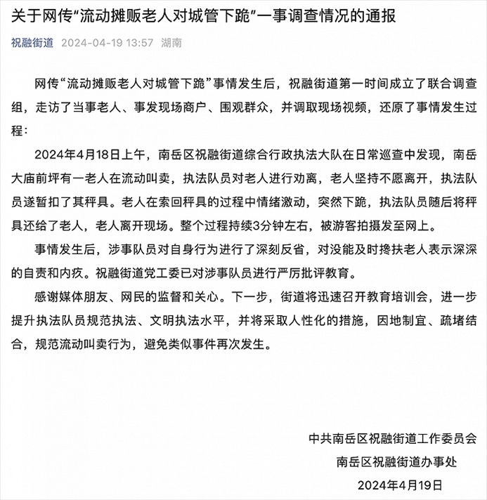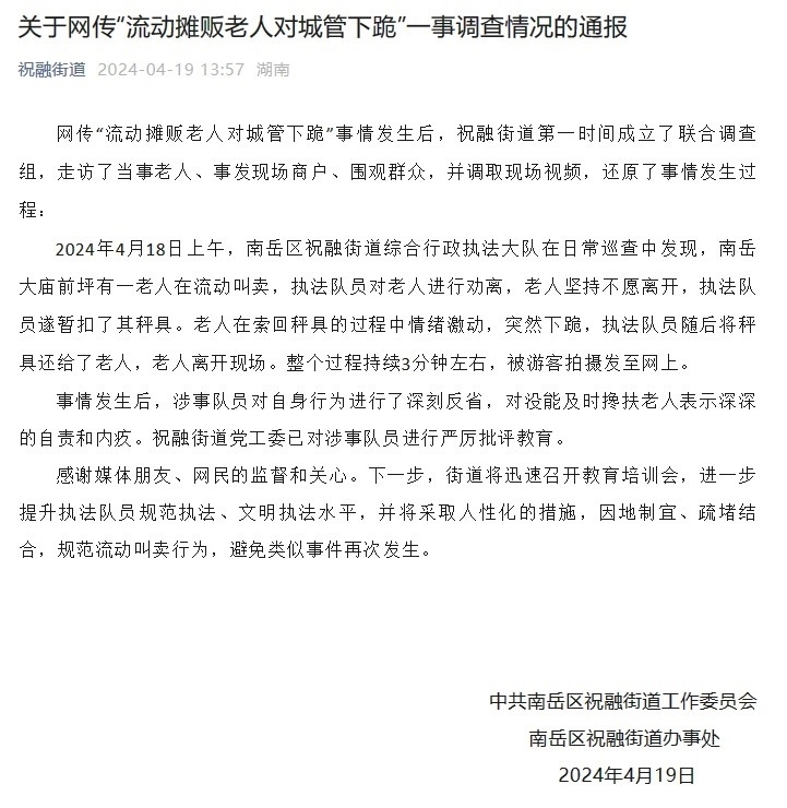 央視網(wǎng)消息:4月19日,衡陽(yáng)南岳區(qū)祝融街道辦事處發(fā)布關(guān)于網(wǎng)傳“流動(dòng)攤販老人對(duì)城管下跪”一事調(diào)查情況的通報(bào)。