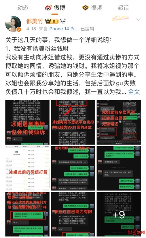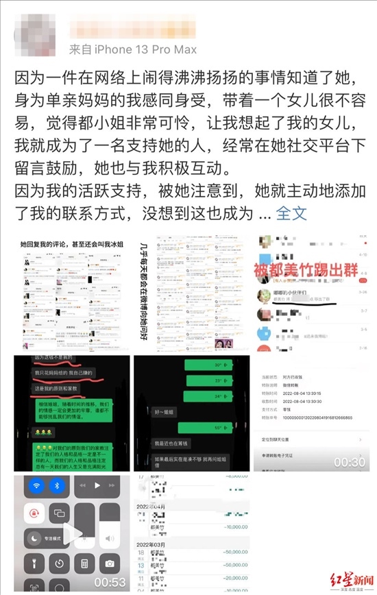 4月15日,都美竹粉絲朱姐發(fā)文稱(chēng),她先后給都美竹轉(zhuǎn)款近20萬(wàn)元,現(xiàn)在認(rèn)為都美竹“賣(mài)慘”騙錢(qián)。她希望都美竹還錢(qián),但對(duì)方只給她轉(zhuǎn)了3萬(wàn)元。