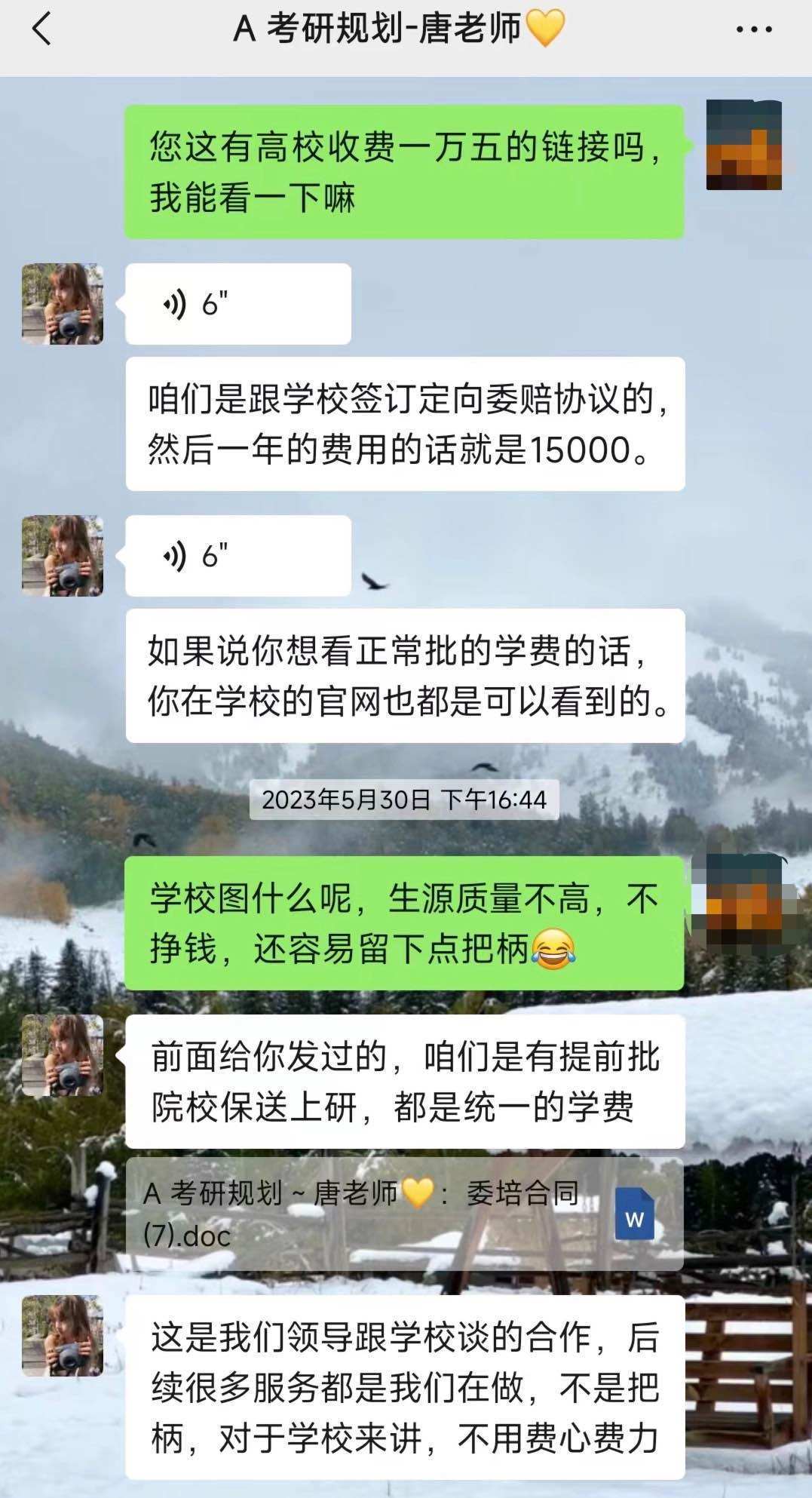 陳鑫說(shuō),對(duì)方得知他計(jì)劃報(bào)考中央財(cái)經(jīng)大學(xué)非全日制MBA后,還表示機(jī)構(gòu)可以提供學(xué)費(fèi)優(yōu)惠,一般MBA的學(xué)費(fèi)大概是20萬(wàn)左右,但該機(jī)構(gòu)的招生老師說(shuō)他們和中央財(cái)經(jīng)大學(xué)、對(duì)外經(jīng)貿(mào)大學(xué)、北京工商大學(xué)三所大學(xué)的非全日制工商管理專(zhuān)業(yè)都有渠道合作,不僅可以保證筆試、面試通過(guò),還可以幫他走定向委培協(xié)議,這樣學(xué)費(fèi)就只需要15000元一年。