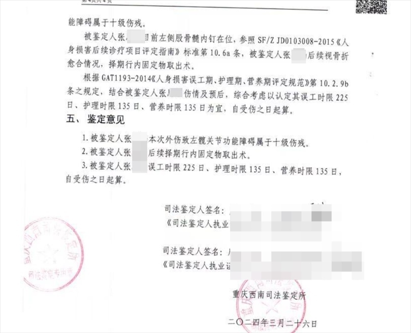張同學(xué)介紹,第一次開庭主要是確定鑒定機(jī)構(gòu)。張同學(xué)提供的司法鑒定書顯示,2024年3月26日,重慶西南司法鑒定所鑒定認(rèn)為,她本次外傷致左髖關(guān)節(jié)功能十級傷殘。其左側(cè)股骨髓內(nèi)釘在位,后續(xù)視骨折愈合情況,擇期行內(nèi)固定物取出術(shù)。