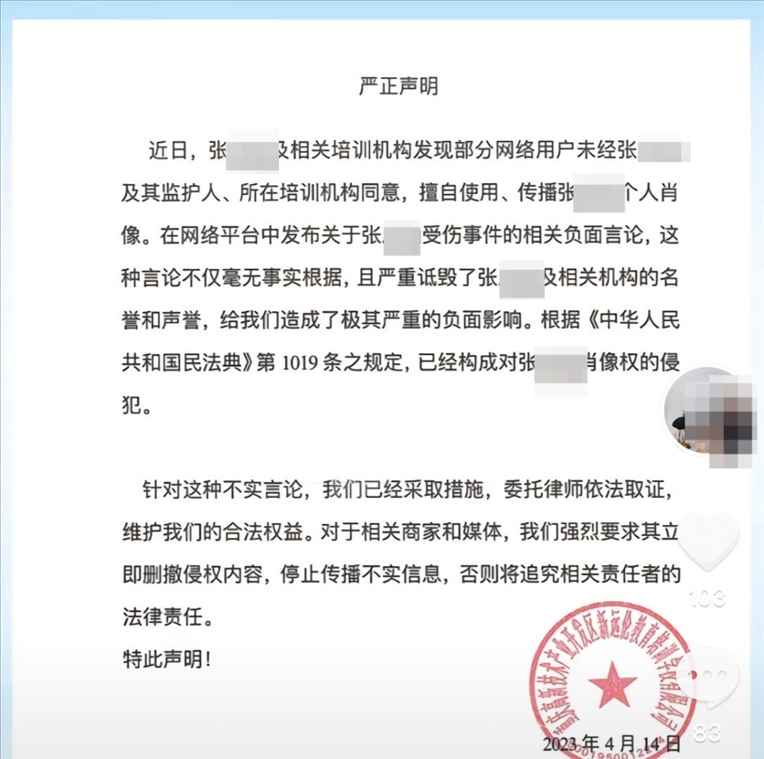紅星新聞注意到,遠(yuǎn)倫舞蹈帳號2023年2023年4月曾發(fā)布一則聲明。落款為重慶高新技術(shù)產(chǎn)業(yè)開發(fā)區(qū)新遠(yuǎn)倫教育培訓(xùn)學(xué)校有限公司(下稱遠(yuǎn)倫培訓(xùn)學(xué)校)。聲明稱,近日,張某涵及相關(guān)培訓(xùn)機(jī)構(gòu)發(fā)現(xiàn)部分網(wǎng)絡(luò)用戶未經(jīng)張某涵及其監(jiān)護(hù)人、所在培訓(xùn)機(jī)構(gòu)同意,擅自使用、傳播張某涵個人肖像。在網(wǎng)絡(luò)平臺中發(fā)布關(guān)于受傷事件的相關(guān)負(fù)面言論,這種言論不僅毫無事實(shí)根據(jù),且嚴(yán)重詆毀了張某涵及相關(guān)機(jī)構(gòu)的名譽(yù)和聲譽(yù),給公司造成了極其嚴(yán)重的負(fù)面影響,已經(jīng)構(gòu)成對張某涵肖像權(quán)的侵犯。