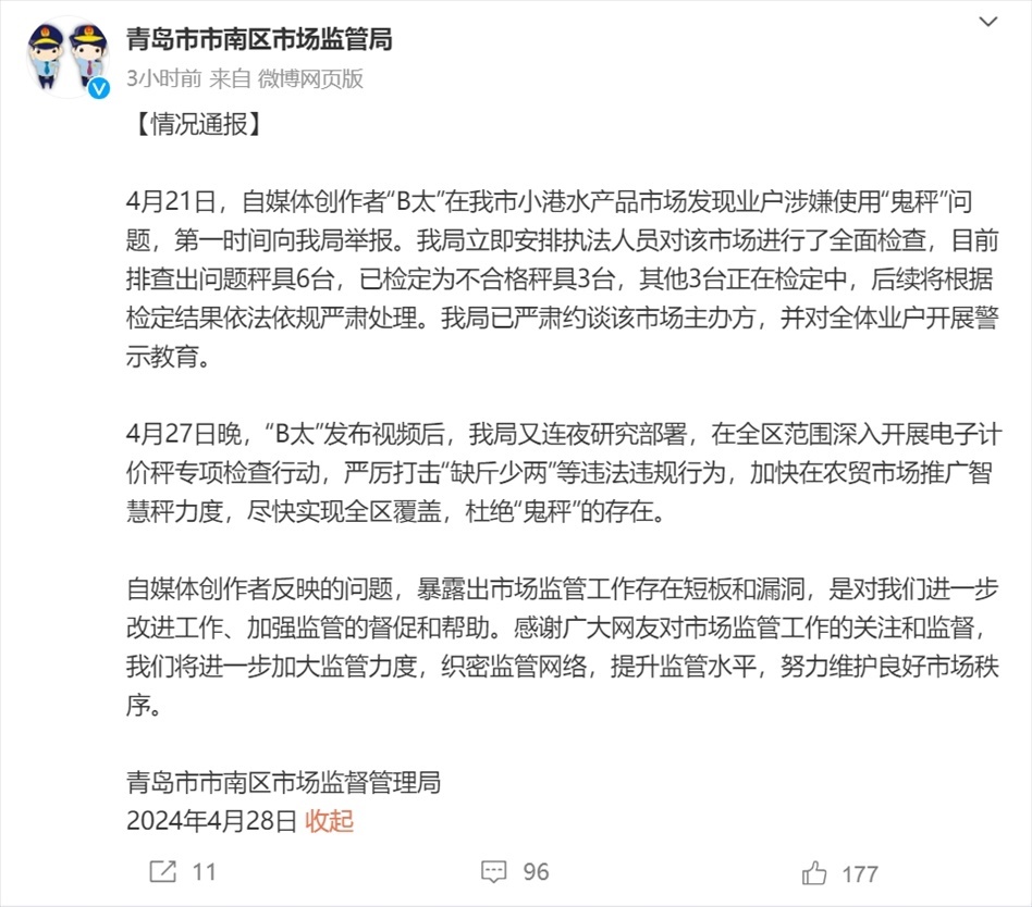 青島市市南區(qū)市場(chǎng)監(jiān)督管理局安排執(zhí)法人員對(duì)該市場(chǎng)進(jìn)行了全面檢查,目前排查出問(wèn)題秤具6臺(tái),已檢定為不合格秤具3臺(tái),其他3臺(tái)正在檢定中,后續(xù)將根據(jù)檢定結(jié)果依法依規(guī)嚴(yán)肅處理。