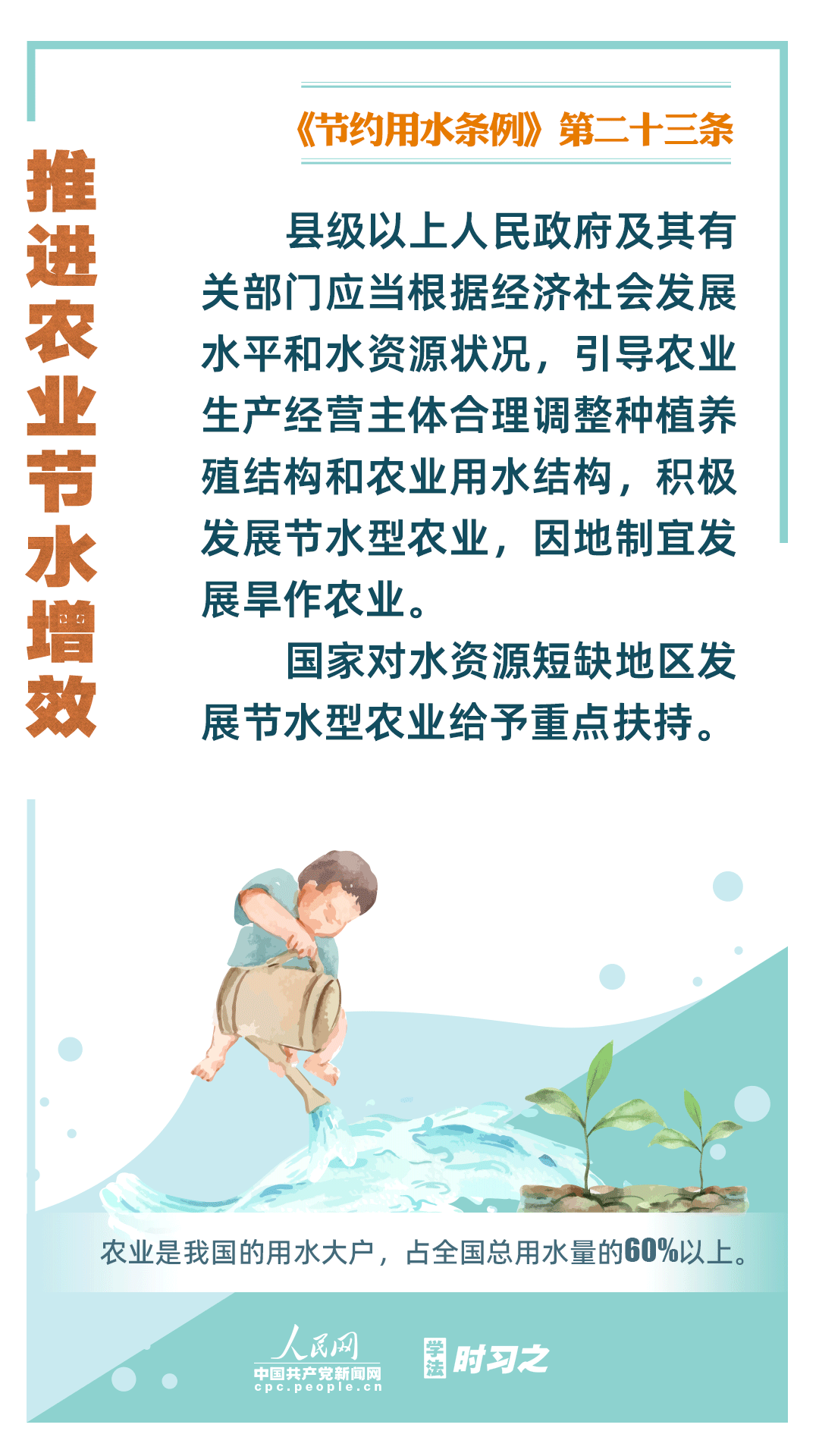《節(jié)約用水條例》(以下簡稱《條例》)將于2024年5月1日起施行,這是我國首部節(jié)約用水行政法規(guī)。節(jié)約用水,是解決我國水資源短缺問題的根本措施,《條例》以水資源可持續(xù)利用為目標(biāo),建立健全節(jié)水制度政策體系,以法治方式和法治途徑實現(xiàn)水資源節(jié)約集約高效利用,促進全社會節(jié)約用水。