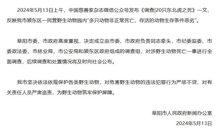 央視網(wǎng)消息:據(jù)“阜陽發(fā)布”微信公眾號消息,阜陽市人民政府新聞辦公室發(fā)布情況通報,2024年5月13日上午,中國慈善家雜志微信公眾號發(fā)布《調(diào)查|20只東北虎之死》一文,反映阜陽市潁東區(qū)一民營野生動物園內(nèi)“多只動物非正常死亡,存活的動物生存條件惡劣”。