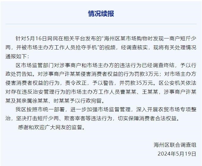 央視網(wǎng)消息:據(jù)“今日海州”微信公眾號(hào)消息,針對5月16日網(wǎng)民在相關(guān)平臺(tái)發(fā)布的“海州區(qū)某市場購物時(shí)發(fā)現(xiàn)一商戶短斤少兩,并被市場主辦方工作人員搶奪手機(jī)”的視頻,經(jīng)調(diào)查核實(shí),現(xiàn)將有關(guān)處理情況通報(bào)如下:區(qū)市場監(jiān)管部門對涉事商戶和市場主辦方的違法行為已經(jīng)調(diào)查終結(jié),予以行政處罰告知。對涉事商戶許某某侵害消費(fèi)者權(quán)益的行為罰款3萬元;對市場主辦方侵害消費(fèi)者權(quán)益的行為,責(zé)令改正,予以警告,并罰款35萬元。區(qū)公安機(jī)關(guān)依法對存在違反治安管理行為的市場主辦方工作人員曹某某、王某某,涉事商戶許某某及其親屬徐某某、時(shí)某某予以行政拘留。
