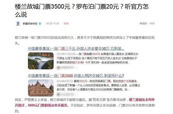 中新網(wǎng)5月20日電 針對(duì)網(wǎng)絡(luò)流傳已久的“樓蘭故城一張門票3500元的說法”,新疆互聯(lián)網(wǎng)信息辦公室官方微博5月20日發(fā)文稱“不屬實(shí)”。