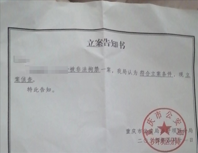 事發(fā)后,家屬向當(dāng)?shù)嘏沙鏊鶊?bào)案。王先生出示的立案告知書顯示,5月11日,重慶市公安局沙坪壩區(qū)分局對前文中的夫妻倆被非法拘禁一案立案偵查。