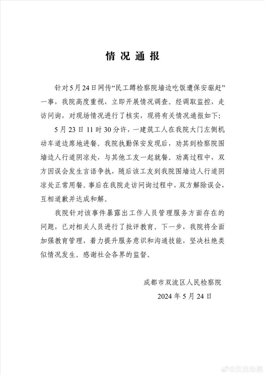 ·成都雙流檢察院回應(yīng)“民工蹲墻邊吃飯?jiān)獗0豺?qū)趕”:系誤會(huì)已和解。