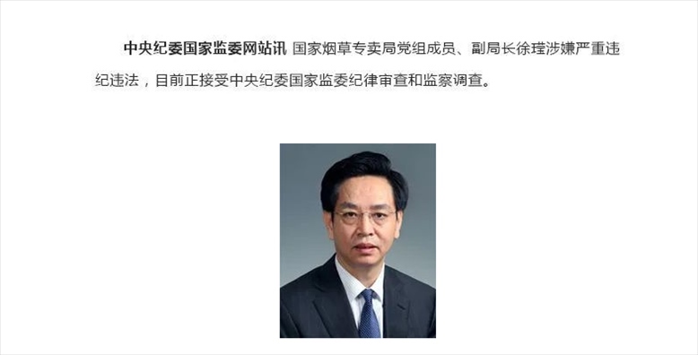 ·國家煙草專賣局黨組成員、副局長接受中央紀(jì)委國家監(jiān)委紀(jì)律審查和監(jiān)察調(diào)查。