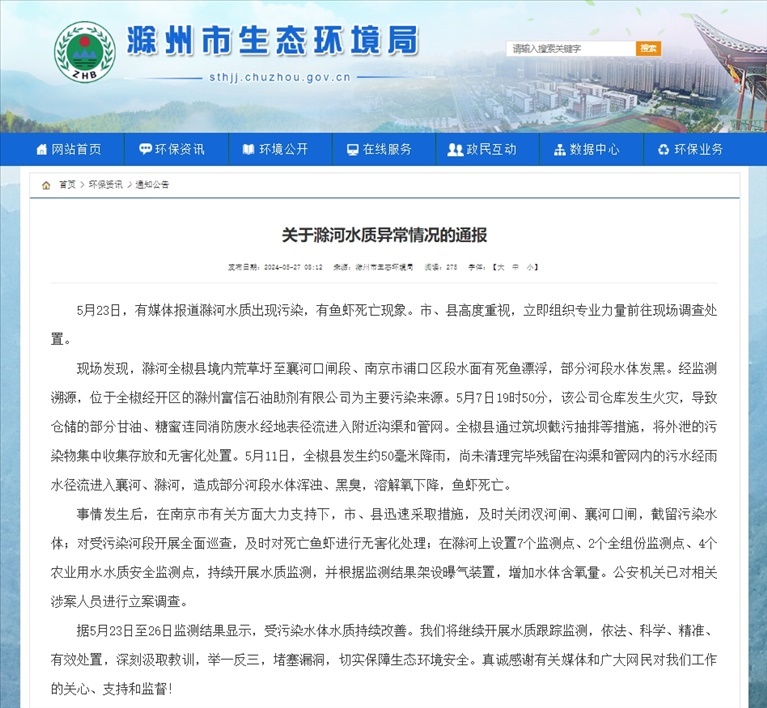 現(xiàn)場發(fā)現(xiàn),滁河全椒縣境內(nèi)荒草圩至襄河口閘段、南京市浦口區(qū)段水面有死魚漂浮,部分河段水體發(fā)黑。經(jīng)監(jiān)測溯源,位于全椒經(jīng)開區(qū)的滁州富信石油助劑有限公司為主要污染來源。5月7日19時50分,該公司倉庫發(fā)生火災,導致倉儲的部分甘油、糖蜜連同消防廢水經(jīng)地表徑流進入附近溝渠和管網(wǎng)。全椒縣通過筑壩截污抽排等措施,將外泄的污染物集中收集存放和無害化處置。5月11日,全椒縣發(fā)生約50毫米降雨,尚未清理完畢殘留在溝渠和管網(wǎng)內(nèi)的污水經(jīng)雨水徑流進入襄河、滁河,造成部分河段水體渾濁、黑臭,溶解氧下降,魚蝦死亡。公安機關已對相關涉案人員進行立案調(diào)查。