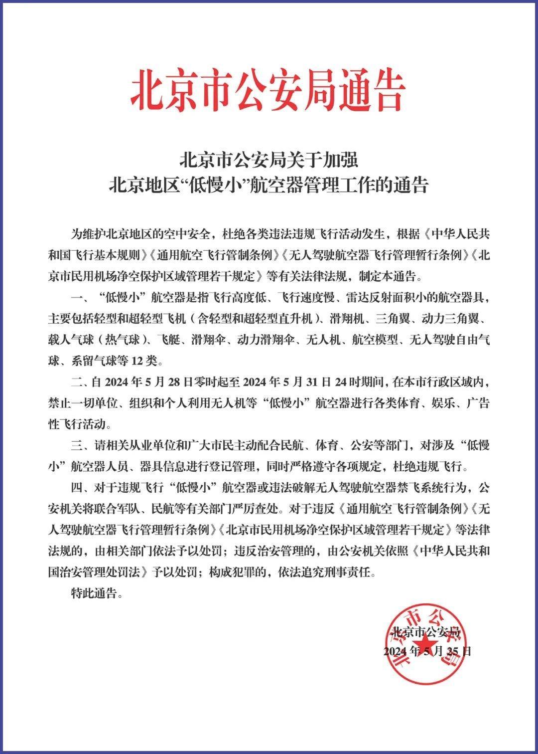央視網(wǎng)消息:據(jù)“首都治安微提示”公眾號(hào)消息,5月25日,北京市公安局發(fā)布了《北京市公安局關(guān)于加強(qiáng)北京地區(qū)“低慢小”航空器管理工作的通告》,其中明確:自2024年5月28日零時(shí)起至2024年5月31日24時(shí)期間,在北京市行政區(qū)域內(nèi),禁止一切單位、組織和個(gè)人利用無人機(jī)等“低慢小”航空器進(jìn)行各類體育、娛樂、廣告性飛行活動(dòng)。