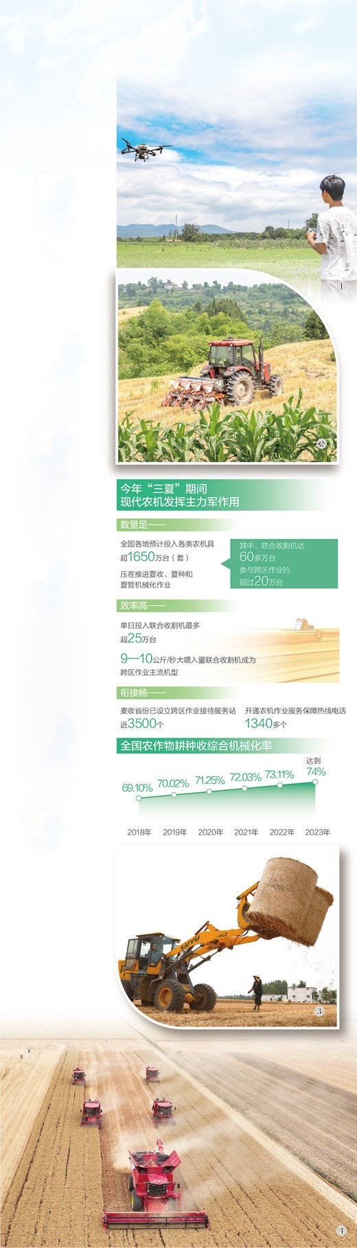 圖①:湖南省藍山縣塔峰鎮(zhèn)荷葉塘村,農(nóng)技人員操作植保無人機在田間進行施肥作業(yè)。彭 華攝(人民視覺) 圖②:四川省蓬溪縣群利鎮(zhèn)五龍村,農(nóng)機手駕駛播種機開展大豆玉米復合播種。吳奉家攝(人民視覺) 圖③:山東省棗莊市嶧城區(qū)古邵鎮(zhèn)新村,農(nóng)機手實施小麥秸稈裝車運輸作業(yè)。孫 慧攝(人民視覺) 圖④:河南省舞陽縣田間,聯(lián)合收割機高效開展麥收作業(yè)。姚 彬攝(人民視覺) 數(shù)據(jù)來源:農(nóng)業(yè)農(nóng)村部