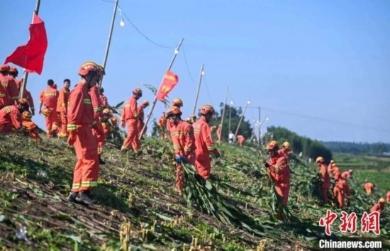 消防人員正在清除間堤的雜草和雜物。中新網(wǎng)記者 楊華峰 攝