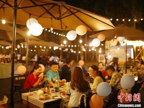 活動現(xiàn)場,搭建了露營帳篷、休閑桌椅一字排開,布置了彩色氣球,提供甜品、水果、飲料等,燈光閃爍、晚風習習,氛圍甜蜜而浪漫。
