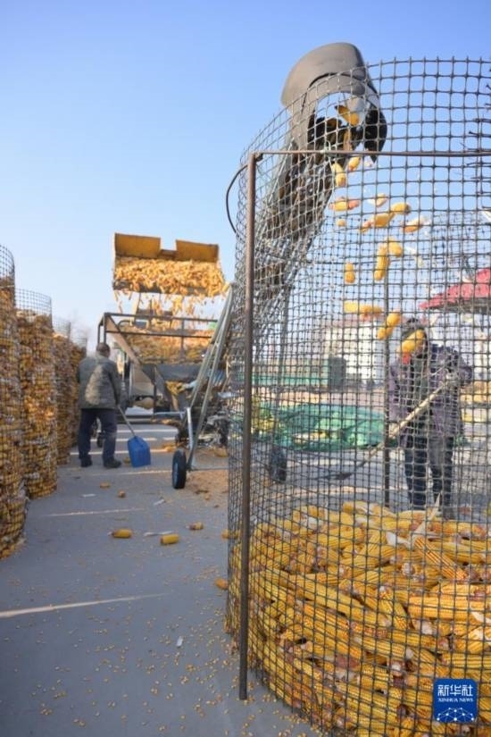 11月13日,在黑龍江省肇東市一處秋糧晾曬場(chǎng),海城雙麗現(xiàn)代農(nóng)機(jī)專業(yè)合作社的農(nóng)民在堆放玉米。