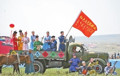 滋潤人心“紅色文藝輕騎兵”烏蘭牧騎隊員在內(nèi)蒙古草原那達慕開幕式上表演。新華社記者 貝 赫攝