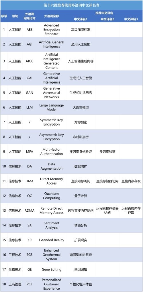 記者12月10日從教育部獲悉,近日,外語(yǔ)中文譯寫(xiě)規(guī)范部際聯(lián)席會(huì)議專家委員會(huì)審議通過(guò)第十六批18組推薦使用外語(yǔ)詞中文譯名。本次擬推薦使用的外語(yǔ)詞中文譯名,均為與人工智能、信息技術(shù)等相關(guān)的詞條。