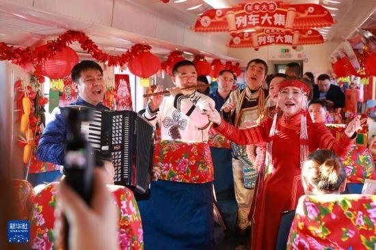 當日,黑龍江開啟2025年首個“列車大集”,在齊齊哈爾開往滿洲里的4187次列車上,乘客購年貨、品民俗、觀看非遺表演,在歸家的旅途中感受濃濃的年味。