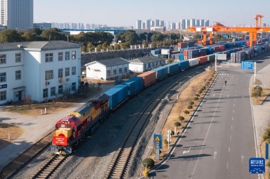 1月29日,滿(mǎn)載集裝箱的中歐班列駛離南京鐵路物流中心堯化門(mén)站貨場(chǎng)(無(wú)人機(jī)照片)。
