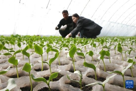 3月20日,在黑龍江省北安市通北鎮(zhèn)東北亞現(xiàn)代蔬菜產(chǎn)業(yè)園溫室大棚內(nèi),技術(shù)人員(右)在指導(dǎo)種植戶管理黃瓜苗。